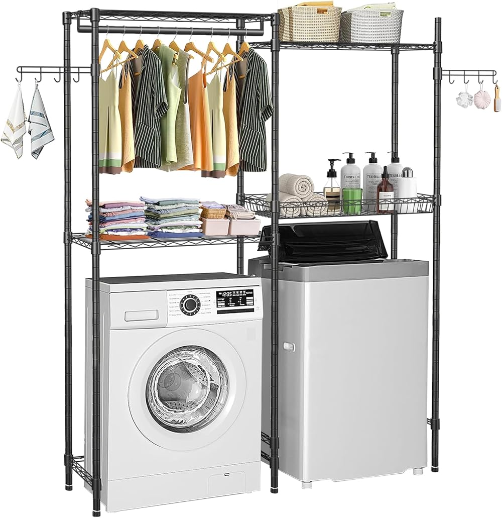 Clothes Drying Rack, 4 Tiers Laundry Room Organization and Storage with Adjustable Shelves, Heavy-Duty Over Washer and Dryer Shelves Space Saver Closet Rack Towel Storage Black