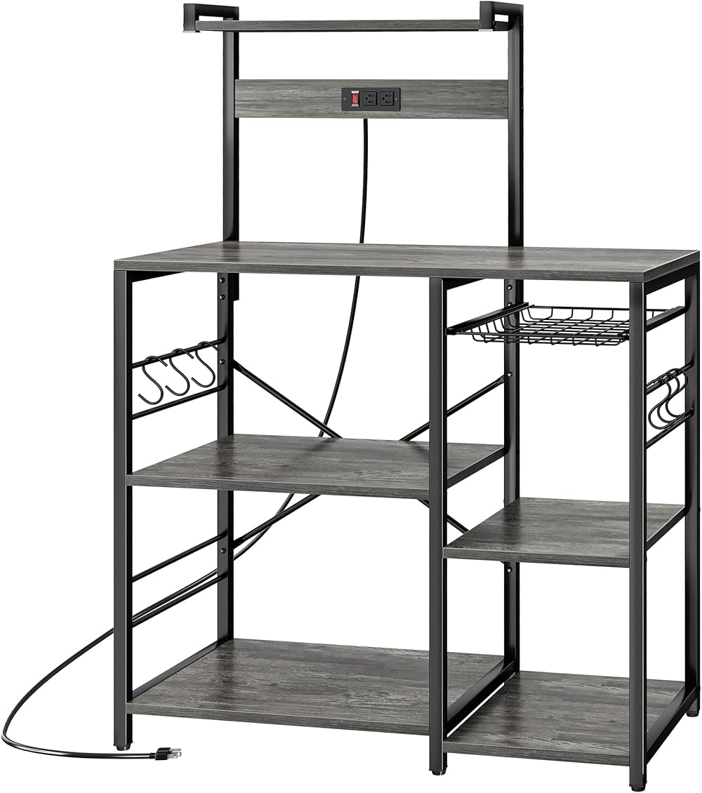 SUPERJARE Bakers Rack with Power Outlet, Microwave Stand, Coffee Bar with Wire Basket, Kitchen Storage Rack with 6 S-Hooks, Kitchen Shelves for Spices, Pots and Pans - Charcoal Gray