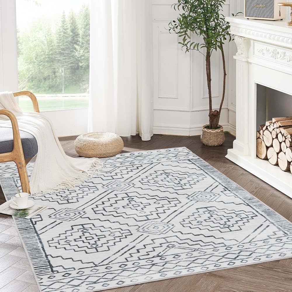 COLLACT 6x9 Area Rug - Moroccan Geometric Large Living Room Rug Washable Rug Bedroom Rug Modern Non Slip Rug Low Pile Thin Throw Rug Boho Carpet for Dining Room Office Kitchen (6x9ft Grey On Beige)