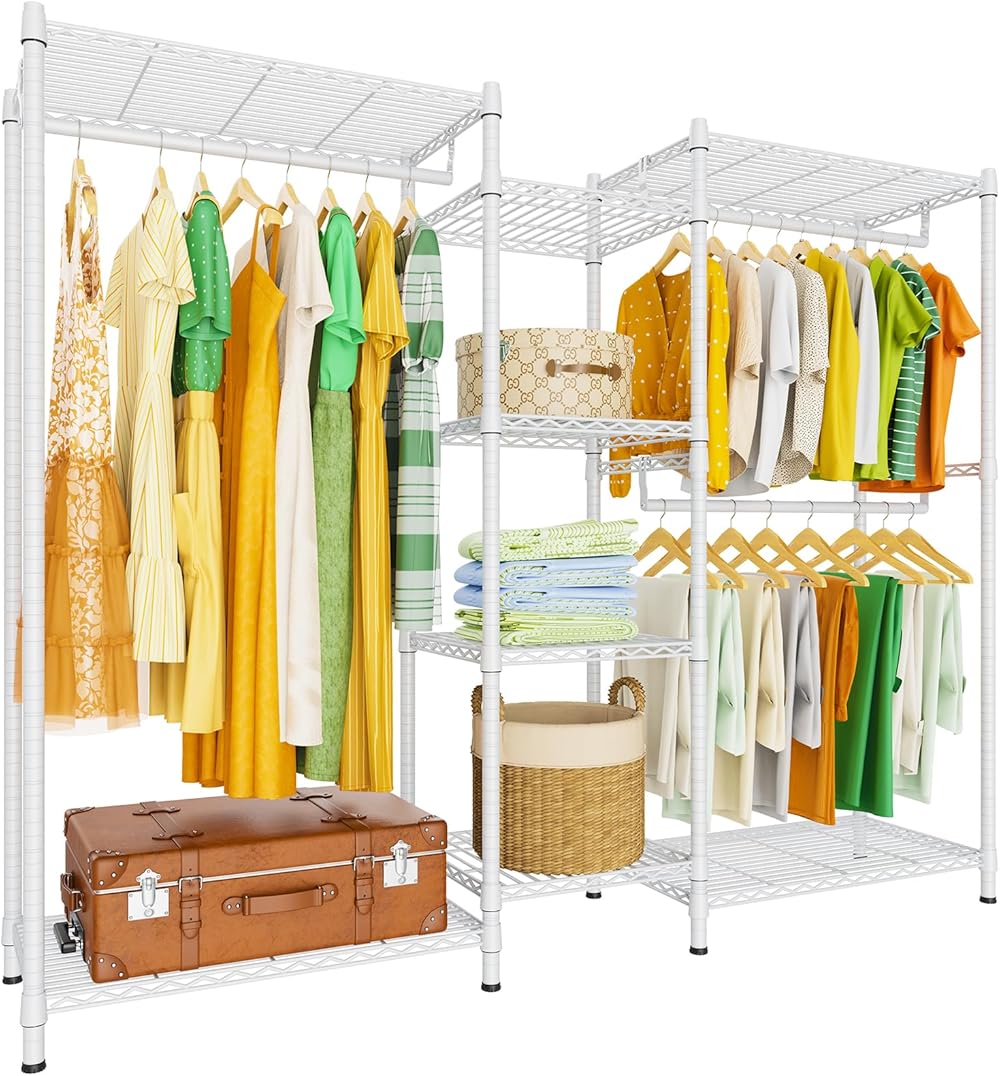 LEHOM G6M Heavy Duty Clothes Rack for Hanging Clothes, Portable Garment Rack Compact Size Closet Organizer, Freestanding Metal Clothing Rack Wardrobe Closet with Storage Shelves for Bedroom, White
