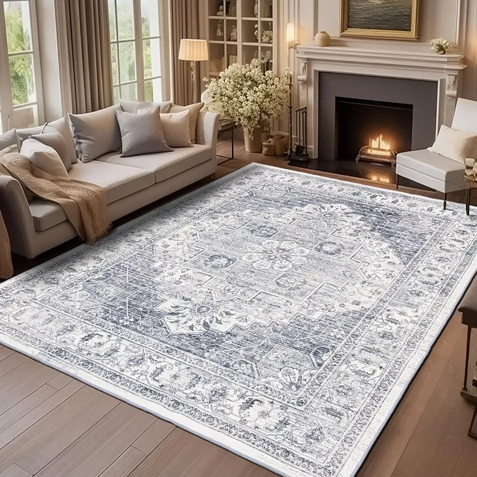 Area Rug for Living Room, Indoor Machine Washable Rug for Bedroom Vintage Rug Dinning Room Floor Carpet Non-Slip Backing Rugs Floral Soft Low-Pile Office Rug (Grey/White, 8' × 10')