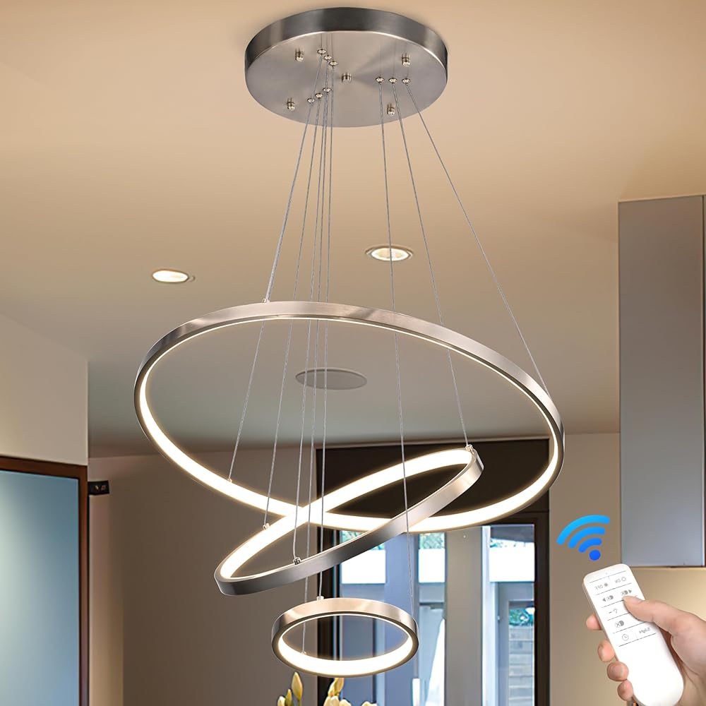 Nickel LED Ring Chandelier, 3-ring Dimmable Modern Chandelier with Remote, Height Adjustable Pendant Light for Dining, Kitchen Island, Living Room, Entryway