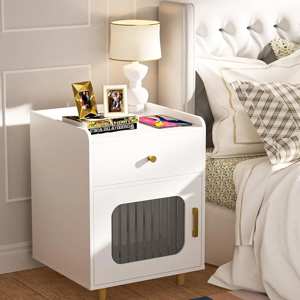 Nightstand,Modern Side Table with 2 Storage Drawer,Bedside Tables with Glass Door,23.7’Kids Stand Night,End Table with Gold Frame,Solid Wooden Legs,Square Stand for Living Room Bedroom