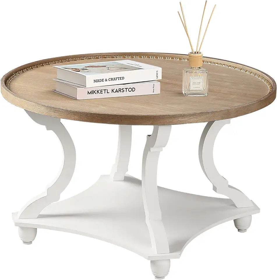 Wnutrees Farmhouse Round Coffee Table,Wood Tray Top Circle Coffee Table with Storage Shelf Rustic Style for Living Room and Vintage Finish,White