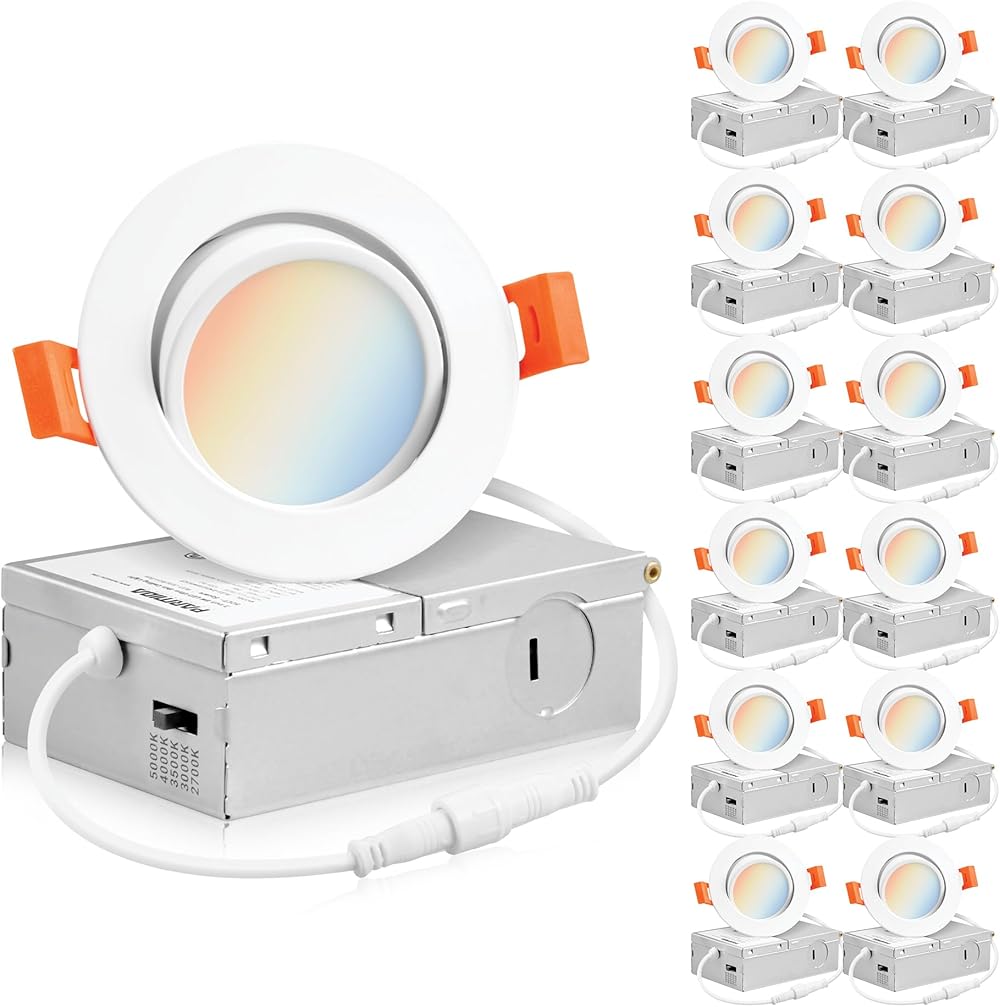 PARMIDA (12 Pack) 3 Inch 5CCT Ultra-Thin LED Adjustable Gimbal Recessed Lighting with J-Box, 2700K/3000K/3500K/4000K/5000K 5 Color Selectable, 8W, Eyeball Canless Slim Panel Lights, Dimmable, IC, ETL