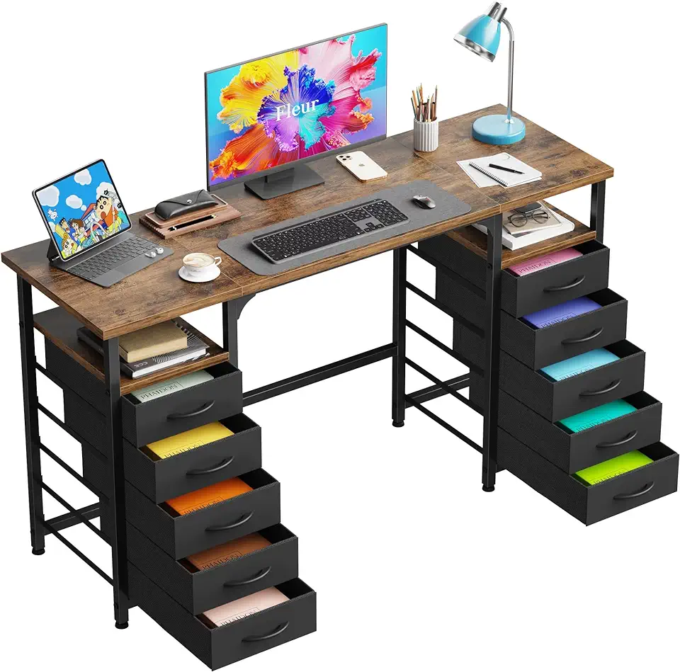 Desk with 10 Fabric Drawers Classified Organizer - 55"/140 Office Desks with Ample Storage, Computer Work Desk Study Writing Table Workstation for Home Office Space Deep Black
