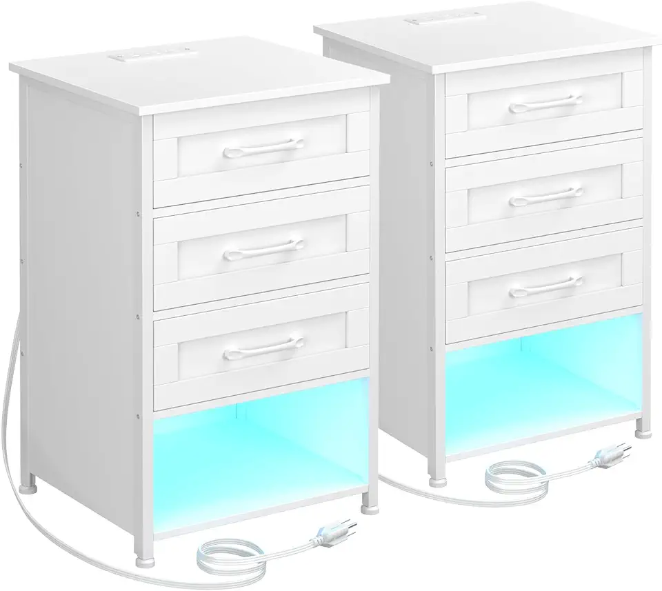 Night Stand Set 2, Nightstand with Charging Station, End Table with LED Light Strip, White 3 Drawer Bedroom side table, Mesa De Noche Para Dormitorio HNS053WT