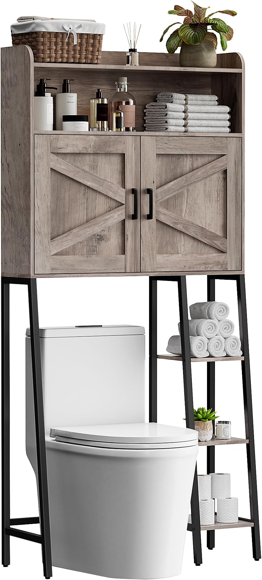 Over The Toilet Storage with Metal Frame and Barn Door,Bathroom Shelf Over Toilet with Storage Compartment,Side Storage Shelf, Freestanding Bathroom Storage Rack,Greige and Black