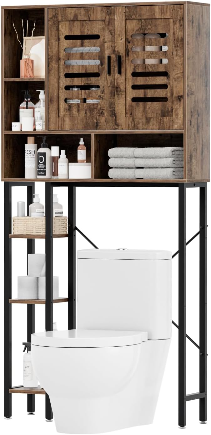 Over The Toilet Storage Cabinet with Shelves and Double Doors, Bathroom Shelf Over Toilet with Storage Compartment, Adjustable Side Storage Shelf, Freestanding Bathroom Storage Rack, Vintage