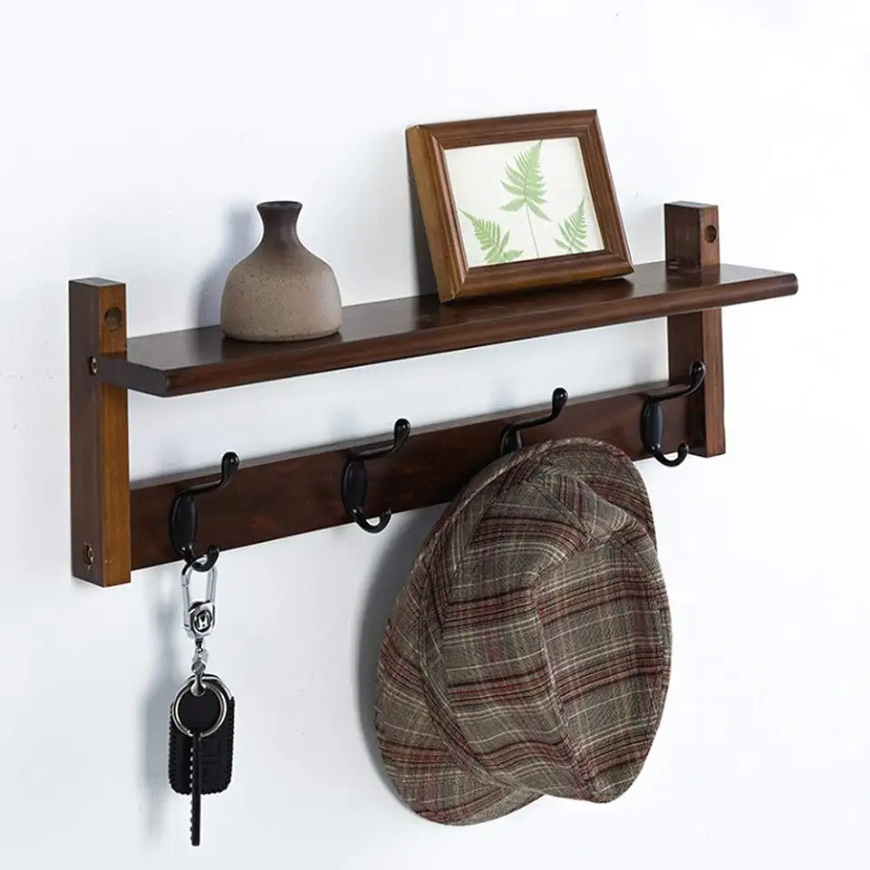 QFFL Coat rack,Coat Hook with Shelf Wall Shelf for Corridor Entrance Living Room Bedroom Kitchen Bathroom- Walnut/White Wall Hanger (Color : Walnut, Size : 4 Hooks)