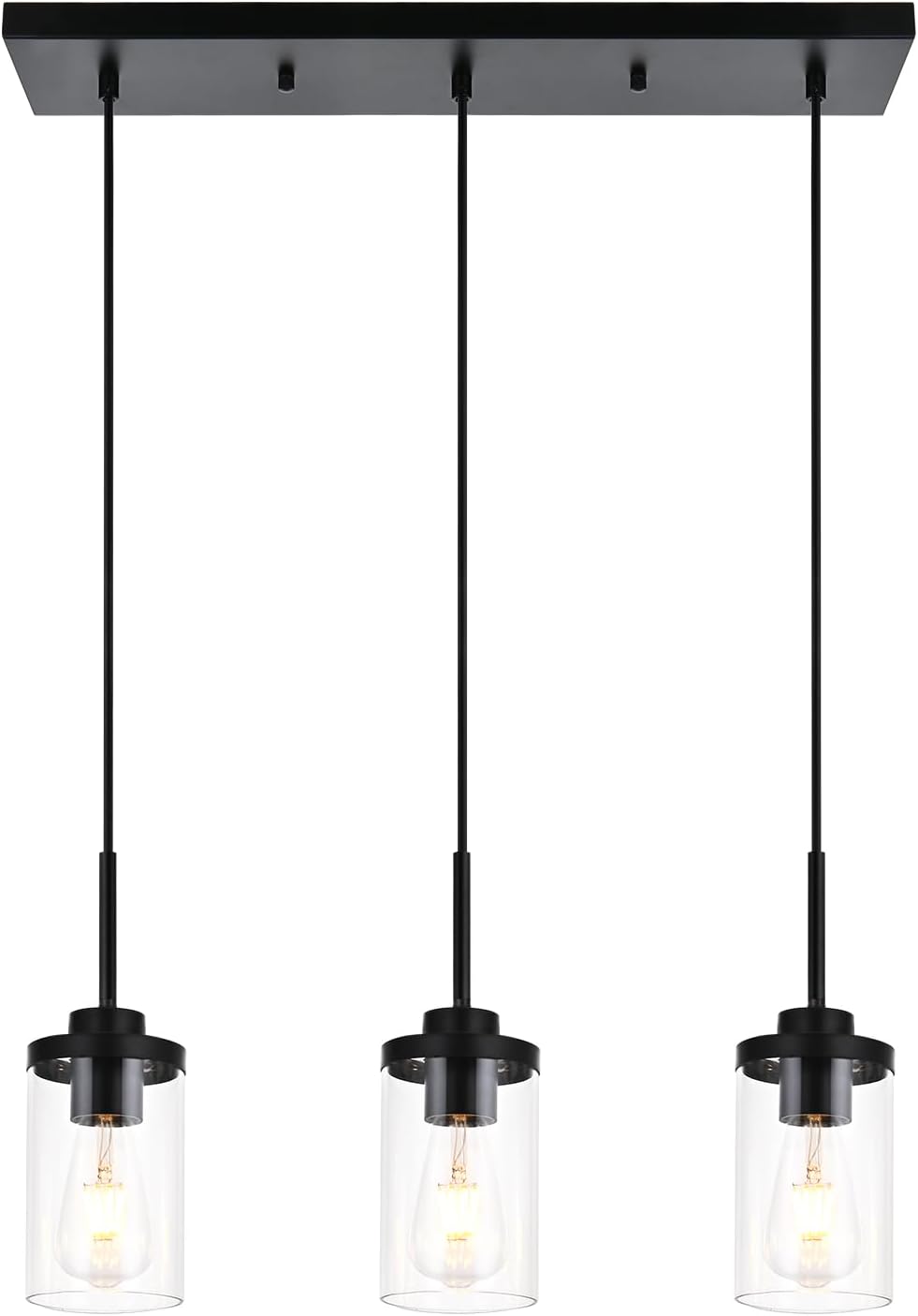 Pendant Lights Fixtures with Clear Glass Shade Black Kitchen Light fixtures 3-Lights Ceiling Hanging Lighting for Kitchen Island Dining Room Bedroom Hall Bar Height Adjustable