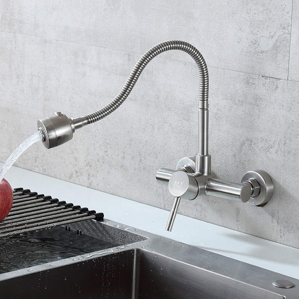 Mixer Tap Kitchen Stainless Steel Wall-mounted Hot Cold Mixing Faucet Single Handle Double Hole In-wall Sink Water Tap Home Washing Pool Faucet With Shower Head