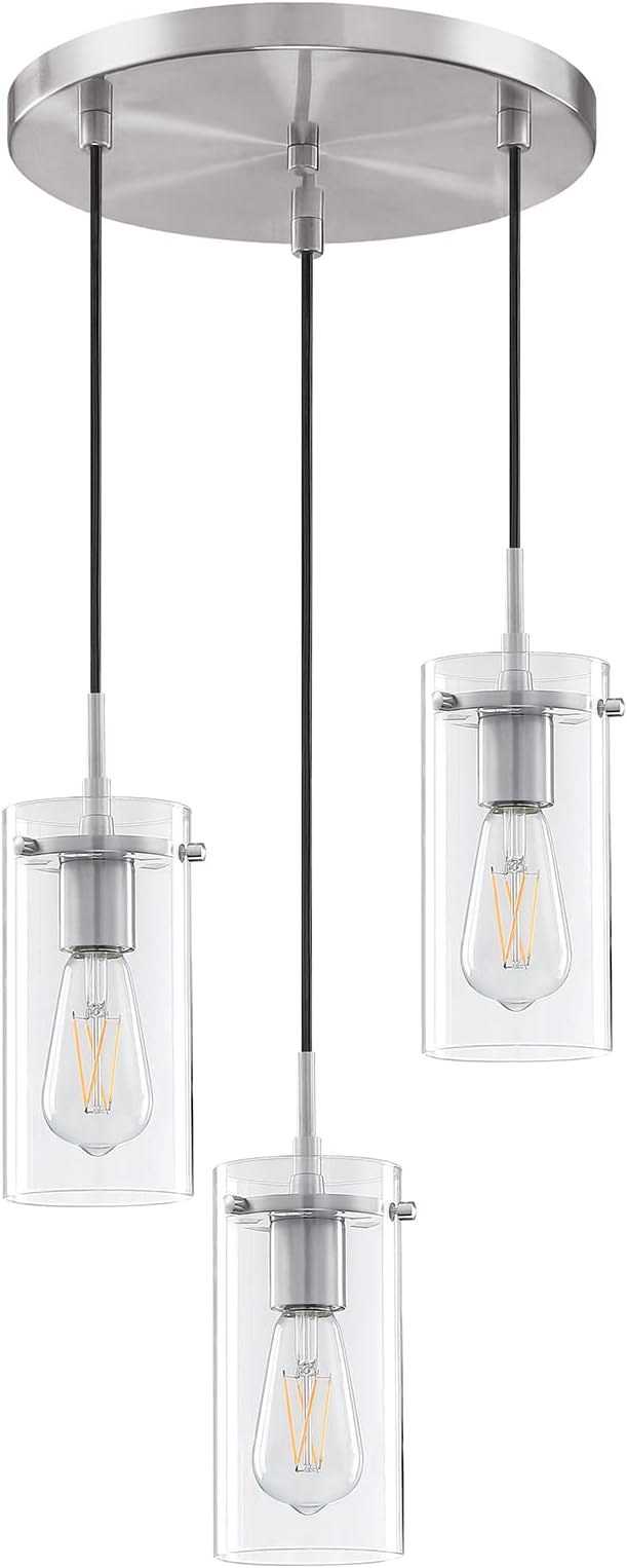 Industrial Vintage Modern 3 Light Hanging Kitchen Island Ceiling Light Brushed Nickel Finish 4 Inch Clear Straight Glass Shade for Dining Room Bedside Dining Room Over Sink