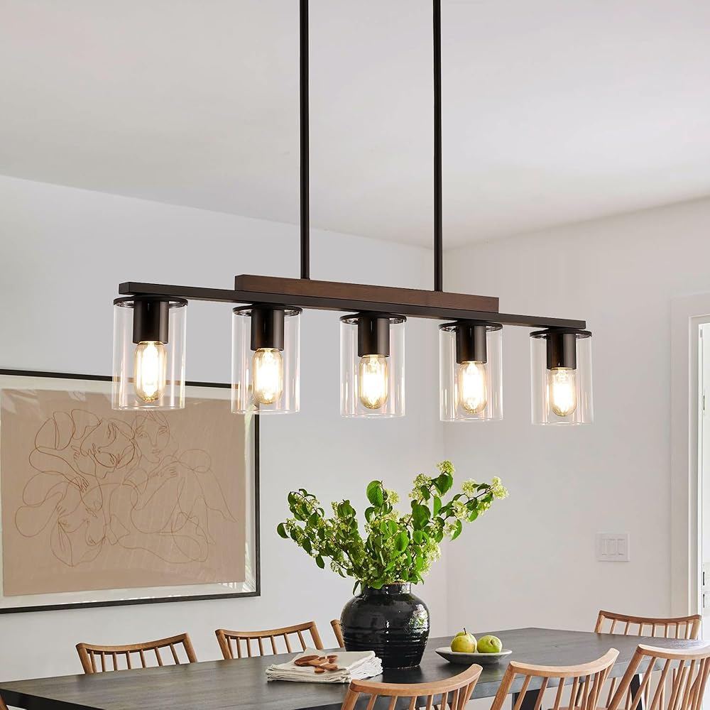 Dining Room Light Fixtures, 5-Light Farmhouse Island Lighting for Kitchen, Black and Wood Pendant Lighting Over Table, Linear Chandelier for Dining Table Living Room