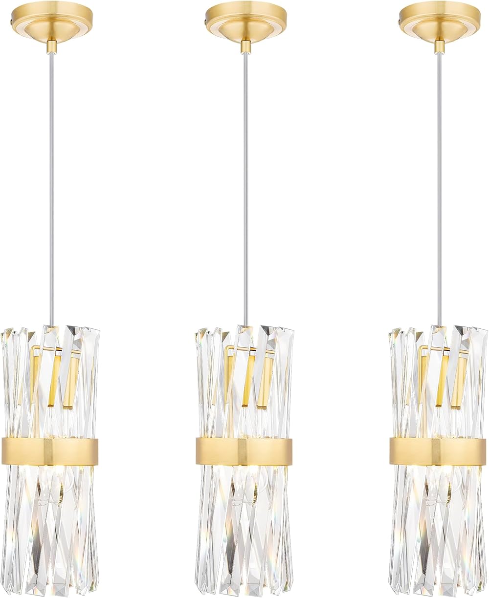 3 Pack Crystal Pendant Light Fixtures, Industrial Kitchen Island Lighting, Gold Hanging Light Fixture, Adjustable Height and Crystal Bar, KR3355-3PK
