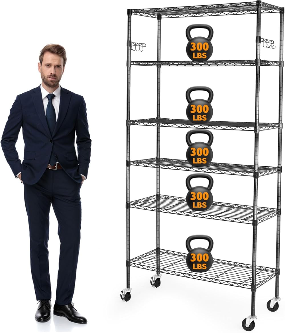6 Tier Storage Shelves with Wheels, 2100lbs Capacity Heavy Duty Shelving Units, 14x36x75inch Adjustable Metal Shelf Wire Shelving Rack for Garage, Kitchen, Office, Black
