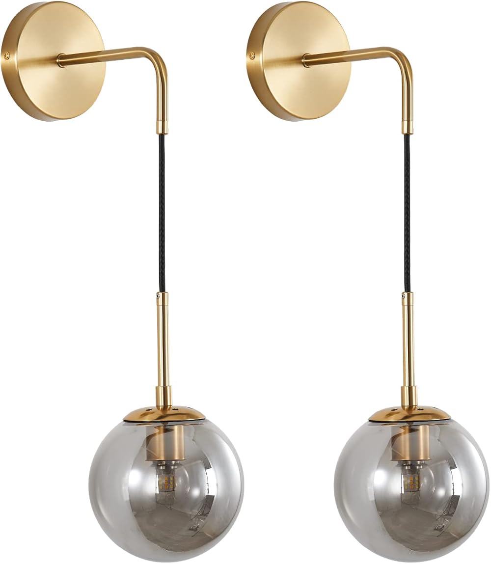 KCO Lighting Modern Glass Globe Wall Sconce Minimalist Gold Wall Mounted Sconce Light with Smoke Grey Lampshade Round Wall Lamp for Bathroom Mirror Bedroom (Smoke Grey-2PC)
