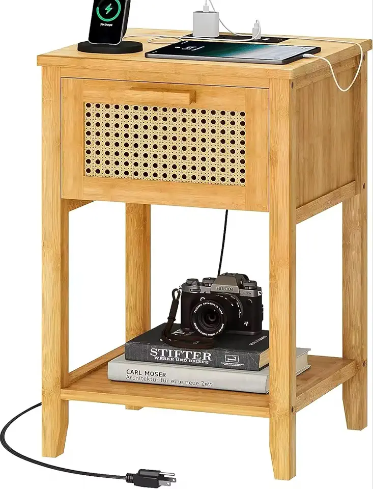 Nightstand with Charging Station Set of 2, Side Table with Drawers, End Table with Open Shelf, Bedside Table with USB Ports and Outlets, Night Stands for Bedroom