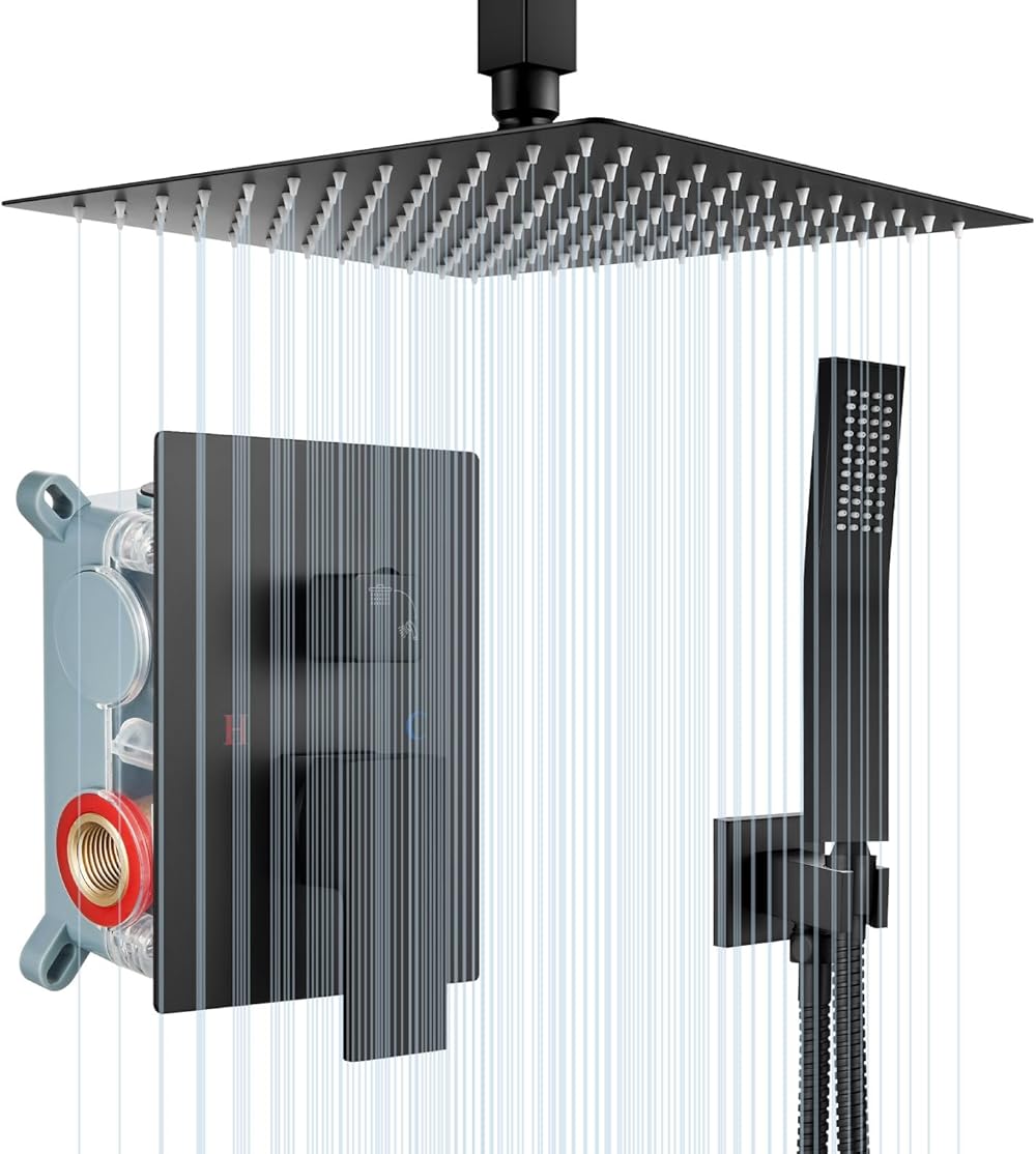 Airuida Matte Black 12 Inch Rainfall Shower System, Ceiling Mount Shower Faucet, Bathroom Shower Fixture with SUS304 Ultra-thin Rainfall Shower Head, Brass Handheld Shower Mixer with Rough-in Valve