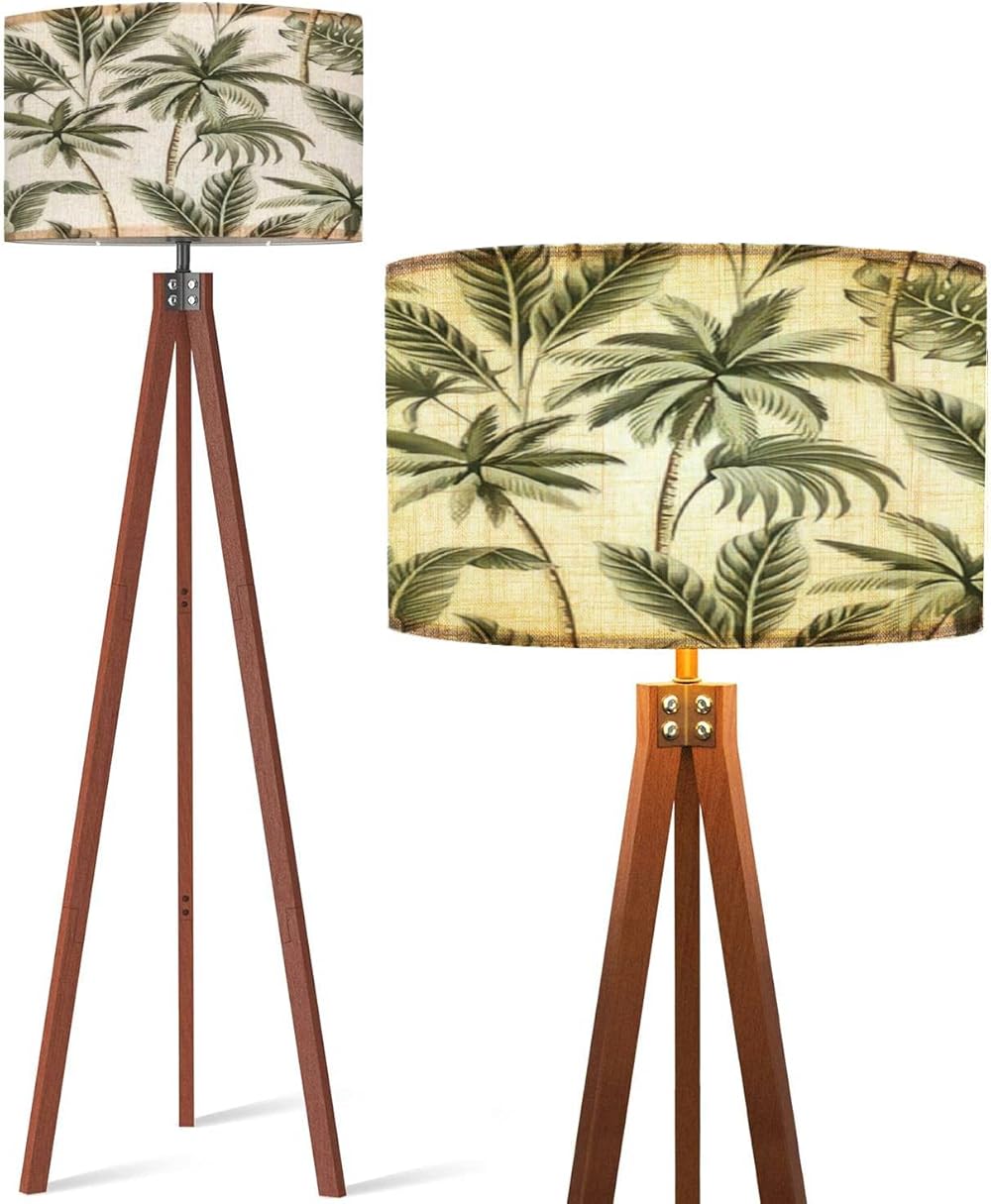 Wood Tripod Floor Lamp Tropical Vintage Hawaiian Palm Trees Banana Palm Leaves Floral Linen Lampshade Dimmable Tall Corner Standing Lamp Modern Floor Reading Lamp for Living Room Bedroom