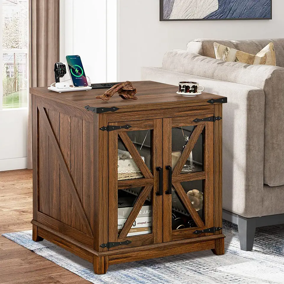 Farmhouse End Table with Charging Station, 24" Large Sofa Side Table with Glass Barn Door, Brown Nightstand with Adjustable Storage Shelf,Wood Square Bedside Table for Living Room,Bedroom