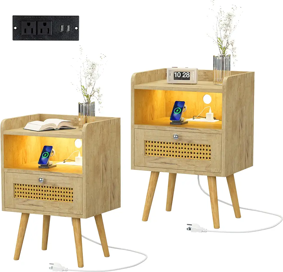 Rattan Nightstands Set of 2, Small End Table with Charging Station and LED Lights, Mid Century Modern Side Table with Storage for Living Room, Bedroom and Small Spaces, Natural Walnut
