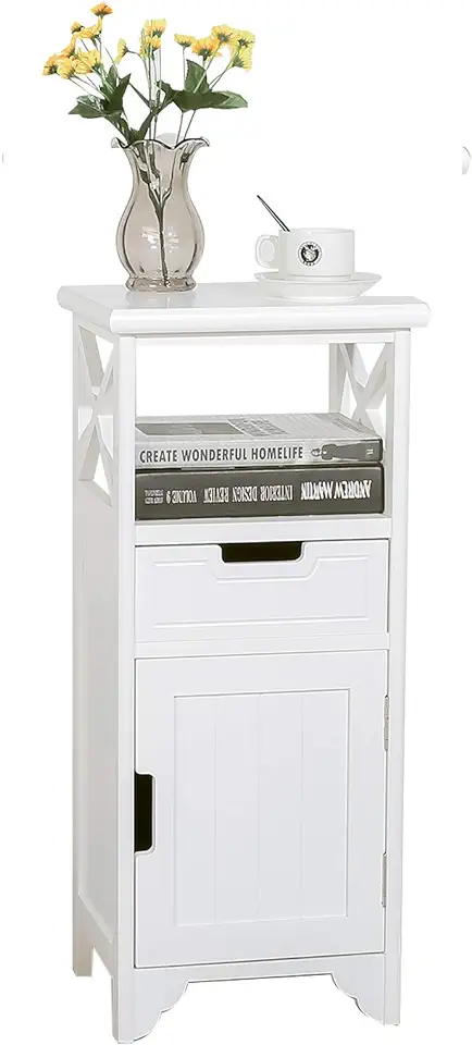 End Table with Drawer and Doors(Fully Assembled), 30" Height Floor Standing Storage Cabinet with Shelf for Bathroom, Wood Slim Nightstand for Bedroom -White