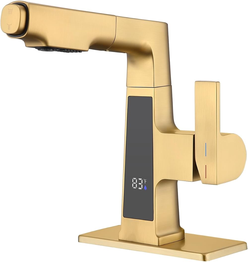 Gold Bathroom Faucet with Pull Out Sprayer, LED Bathroom Faucet with Temperature Display Modern Sink Faucet Champagne Bronze for Kitchen RV Bar with 2 Spray Mode Vanity Faucet with Deck Plate