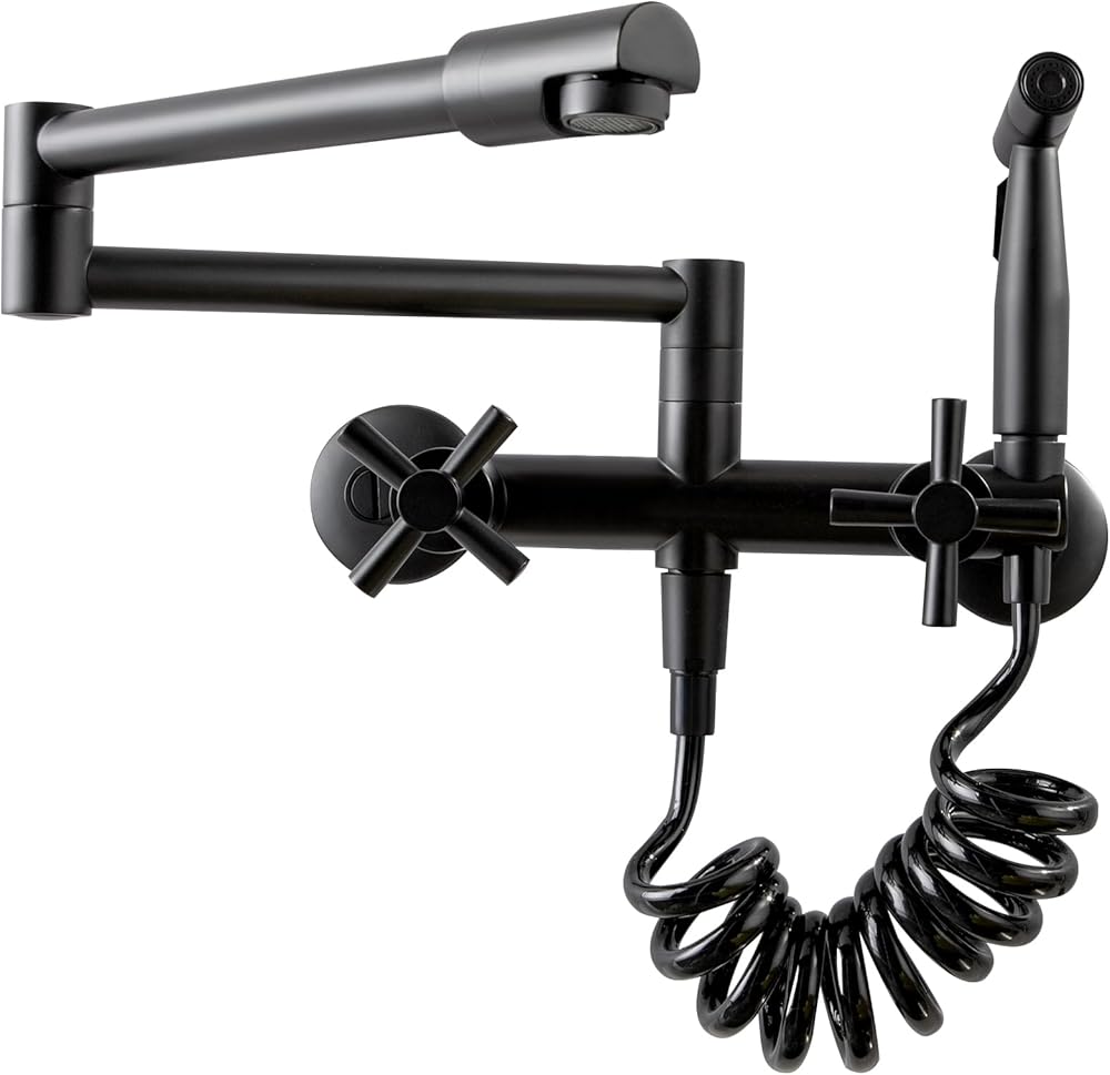 Pot Filler Faucet Wall Mount Kitchen Sink Faucet with Sprayer, Commercial 8 Inch Center Double Joint Swing Arm Folding Faucet with 2 Handle, Matte Black