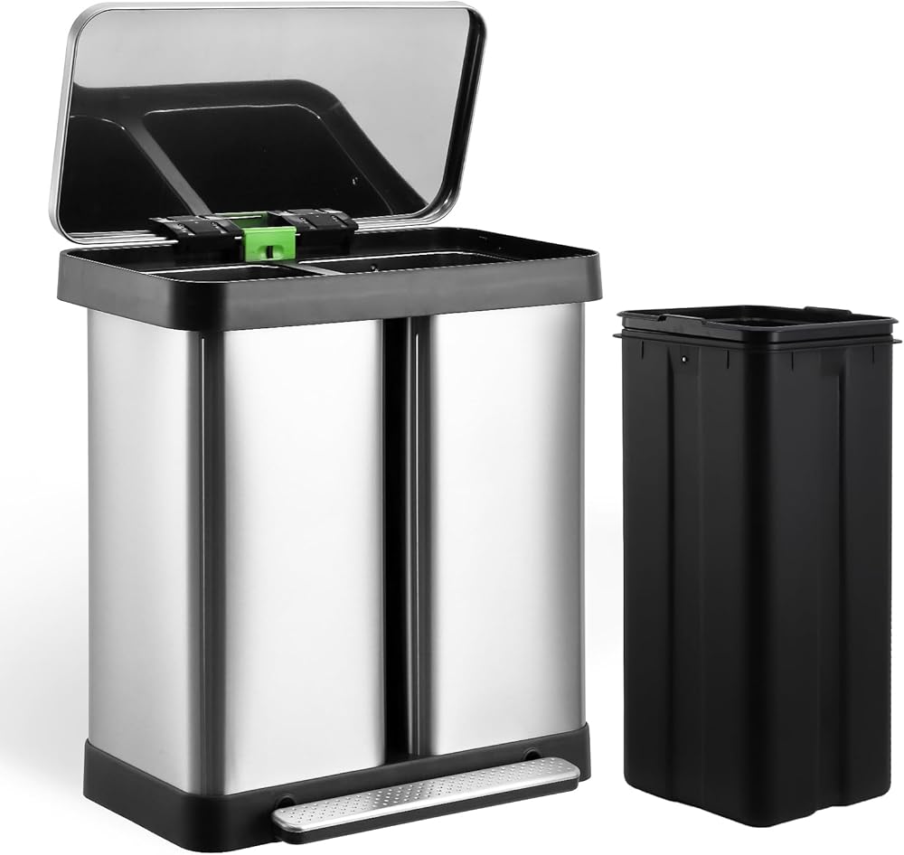Large Dual Trash Can 2 x 8 Gallons- 60 Liters Stainless Steel Kitchen Double Trash Can,2 Compartment Trash Can Combo Garbage Bin with Separated Lid and Foot Pedal for Kitchen