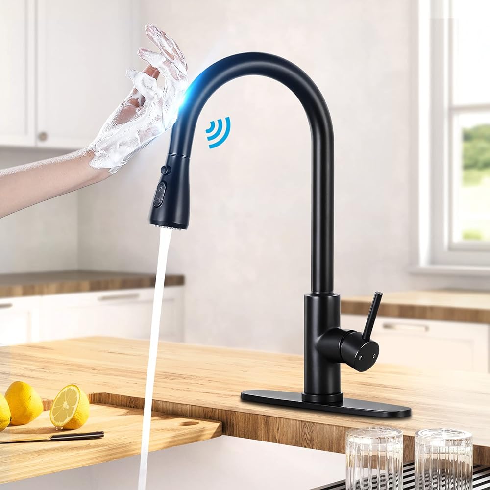 Qomolangma Touch Sensor Kitchen Faucet, Matte Black, Pull Down Sprayer, Single Handle, Gooseneck, 360 Swivel, Stainless Steel, for Deck Mount, Model QOM-PK-018B-Sensor-DP
