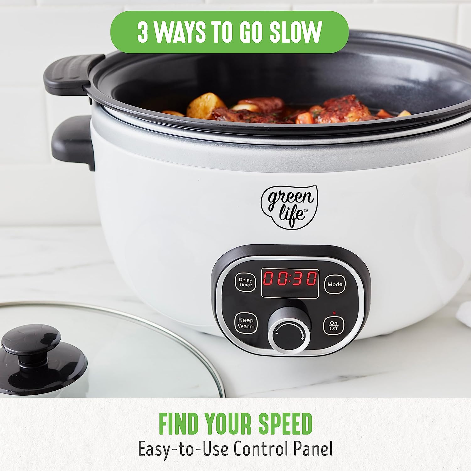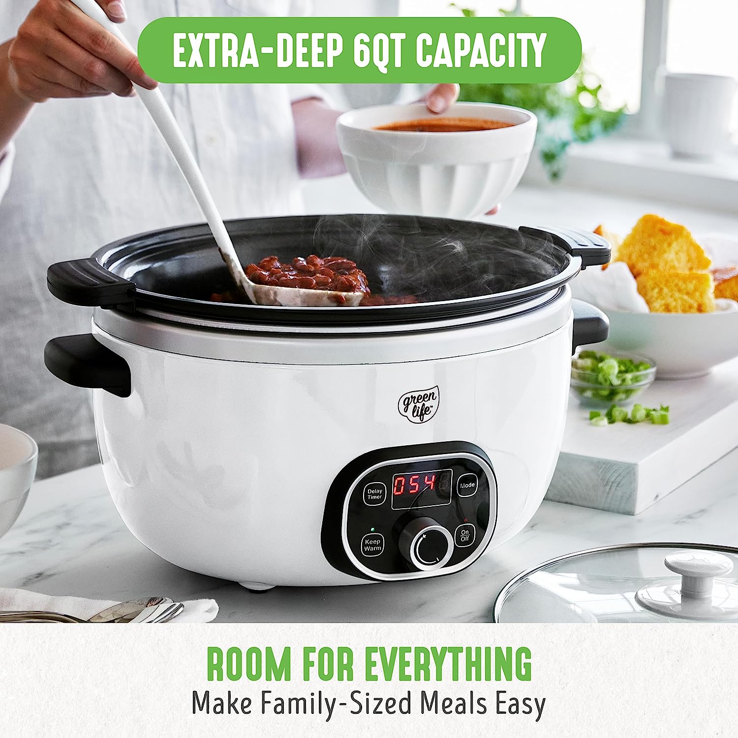 GreenLife Cook Duo Healthy Ceramic Nonstick Programmable 6 Quart Family-Sized Slow Cooker, PFAS-Free, Removable Lid and Pot, Digital Timer, Dishwasher Safe Parts, White