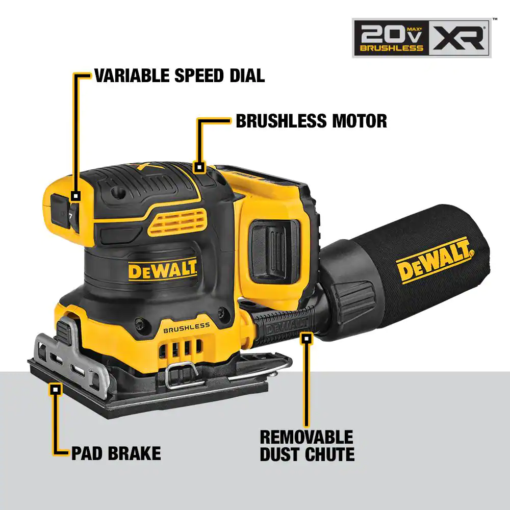 DEWALT DCW200D1 20-Volt MAX XR Cordless Brushless 1/4 Sheet Variable Speed Sander with (1) 20-Volt Battery 2.0Ah & Charger