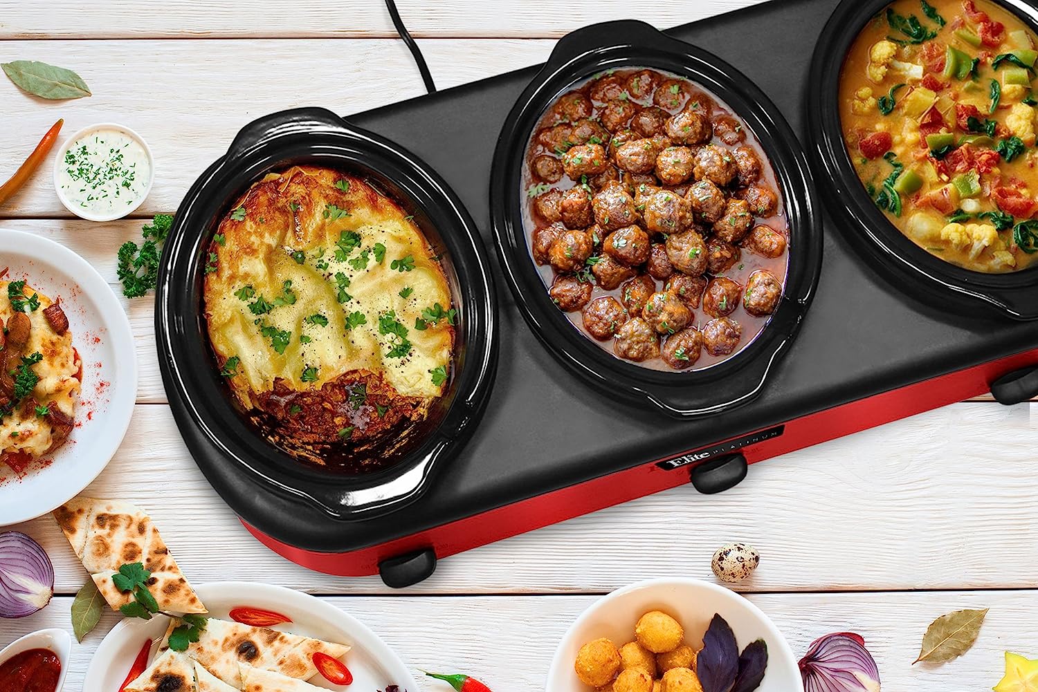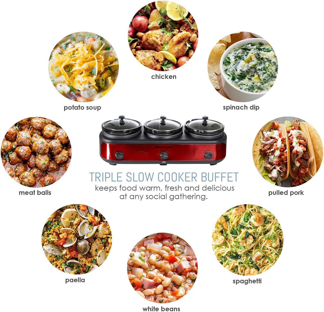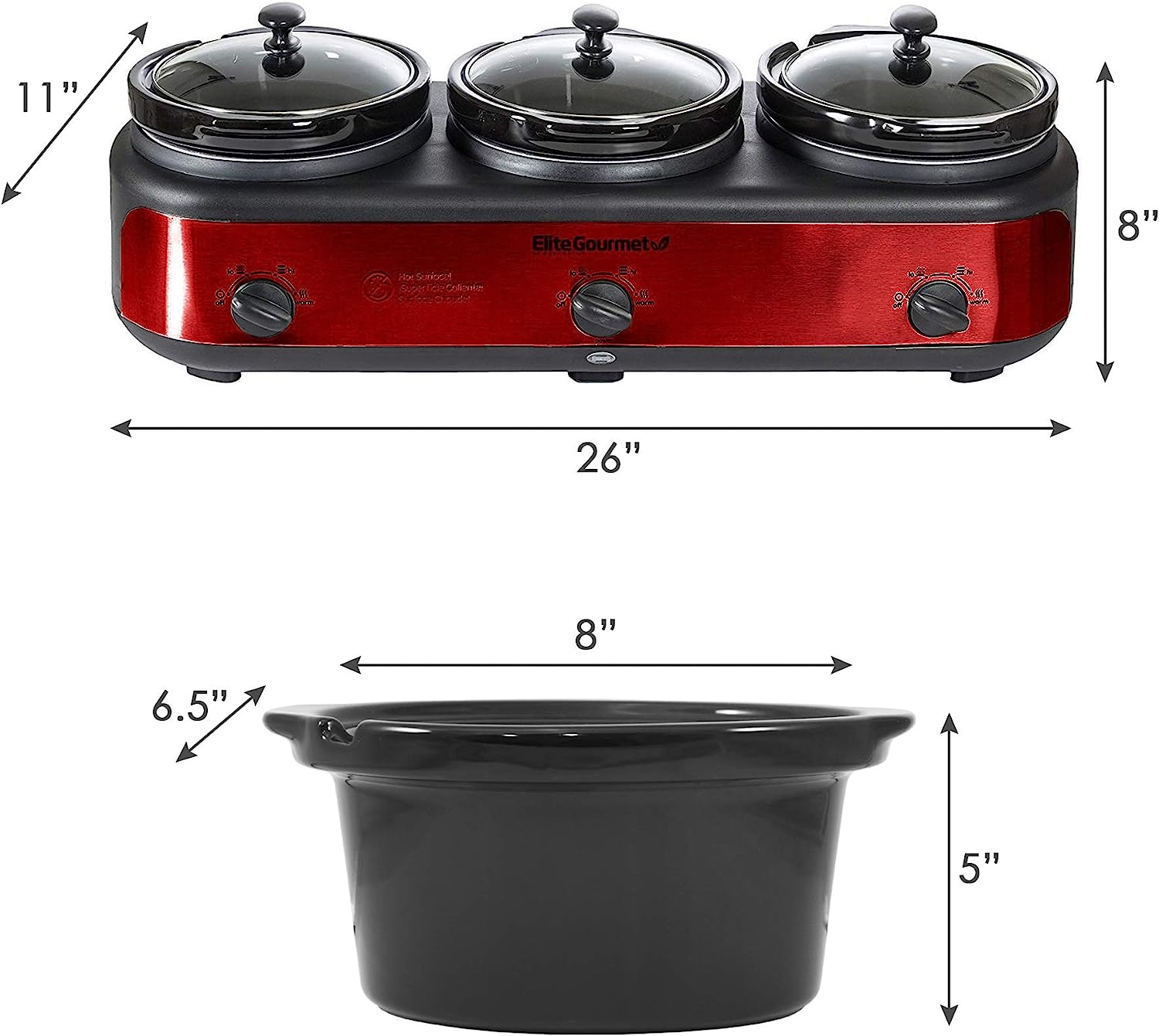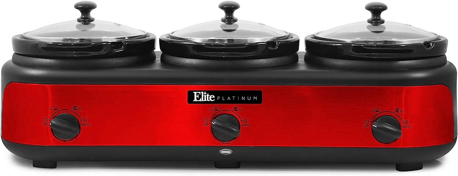 Elite Platinum EWMST-325R Maxi-Matic Triple Slow Cooker Buffet Server Adjustable Temp Dishwasher-Safe Oval Ceramic Pots, Lid Rests, 3 x 2.5 Qt Capacity, Red