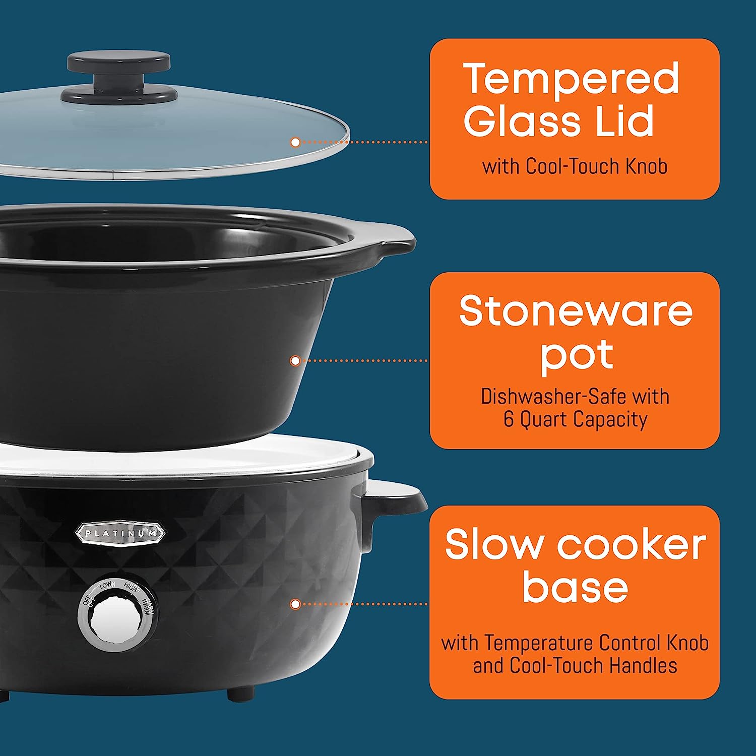 Elite Gourmet MST-1234B## 6 Quart Diamond Pattern Slow Cooker, Removable, Dishwasher-Safe Stoneware Pot with Tempered Glass Lid, Cool-Touch Handles, 6 Quart, Black