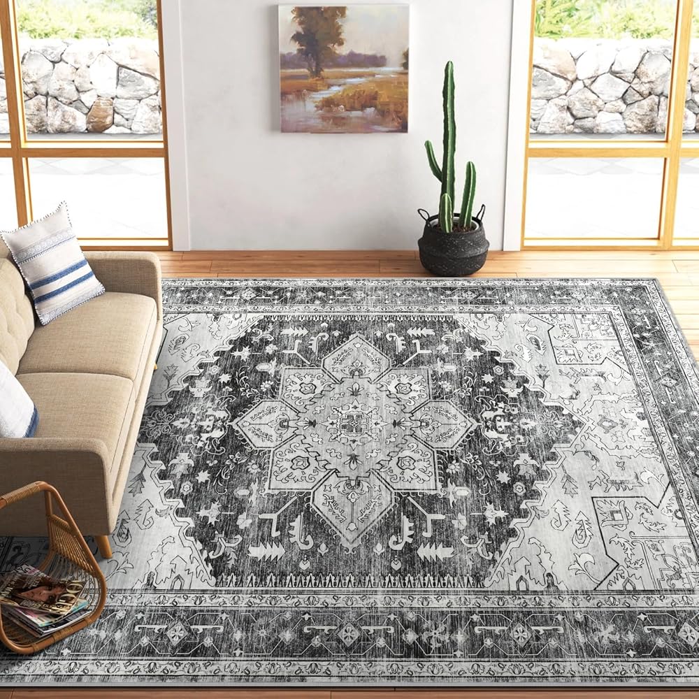 Area Rug 8x10 Large Rug, Non-Slip Washable Boho Vintage Living Room Bedroom Rug with Rubber Backing, Low Pile Faux Wool Soft Distressed Rug Floor Carpet for Living Room, Bedroom (Grey)