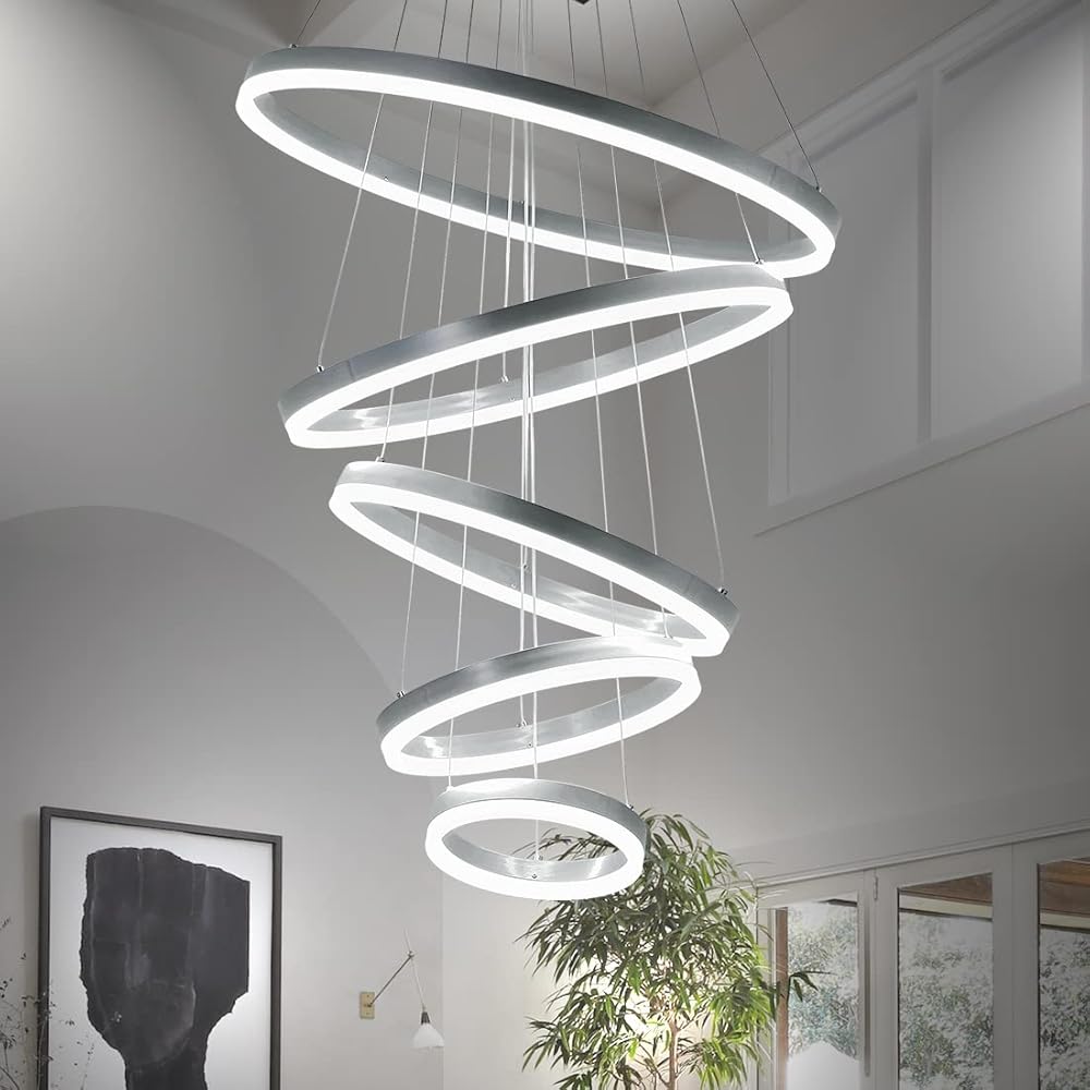 Modern LED Chandelier, 5 Rings Modern Chandelier for Dining Room Lighting Fixture Hanging,Dimmable Led Pendant Light Dimmable with Remote Control,Silver Led Chandelier for Kitchen Lighting Island