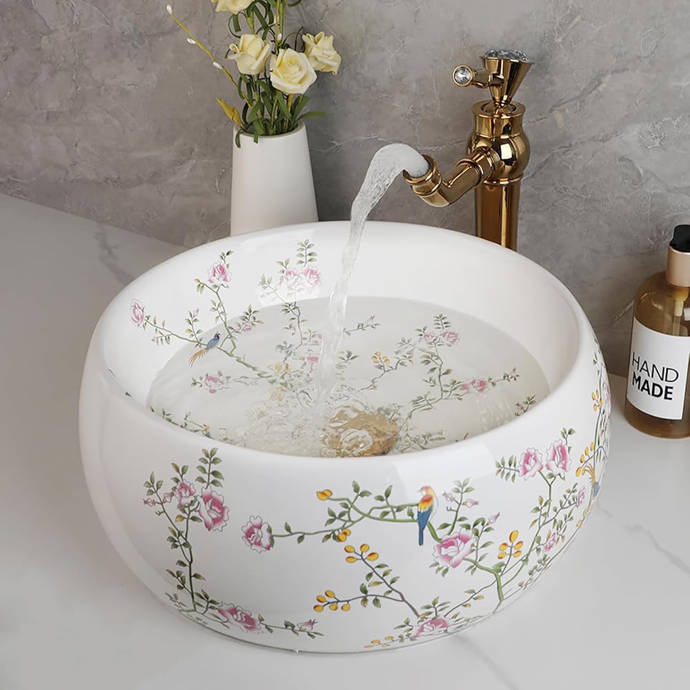 Ceramic White Vessel Sink Round,Flower and Bird Pattern Bathroom Vanity Sink,Artistic Hand Painted Above Counter Sink Basin Bowl