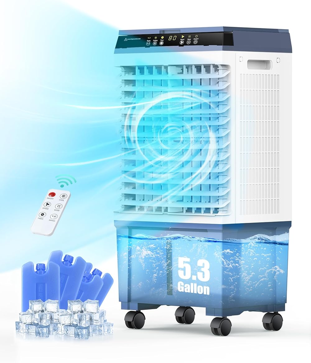Air Choice Evaporative Air Cooler, 1800CFM Swamp Cooler with 12H Timer, 110° Oscillation, Remote Control & 5.3 Gal Water Tank, 3 Speeds, 4 Ice Packs, 3-in-1 Evaporative Cooler for Outdoor Indoor Use