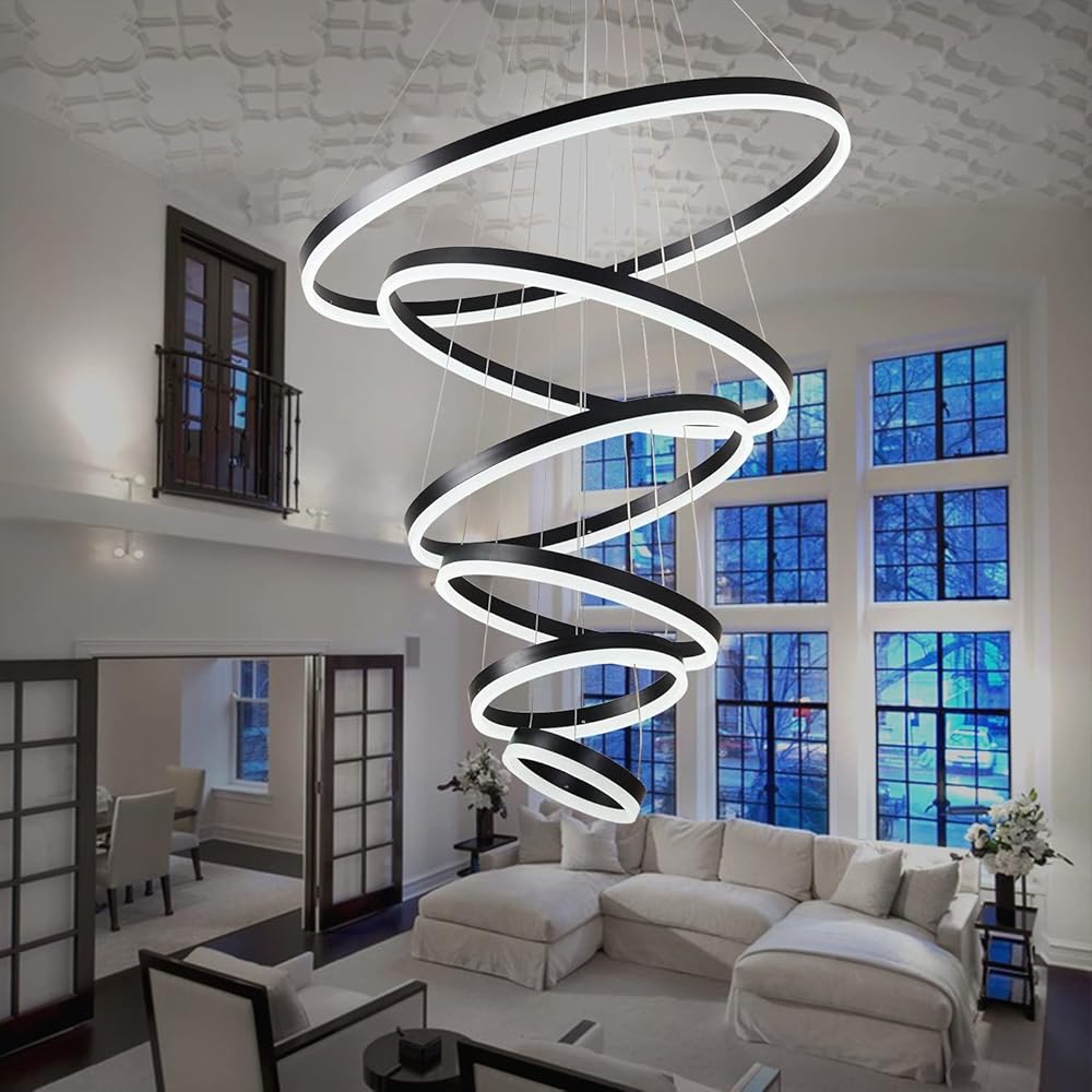 Led Chandelier, Large Modern Chandelier Black 6 Rings Luxury High Ceiling Chandelier Dimmable with Remote, Adjustable Height Foyer Chandeliers Entryway High Ceiling