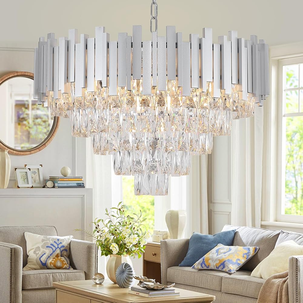 Modern Big Crystal Chandelier for Dining Room Light Fixtures, 24” Chrome 5-Tier Round Big Crystal Chandelier for Living Room Entryway Kitchen Island