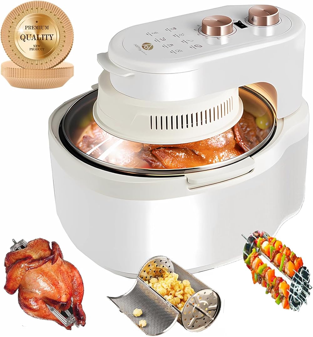 10-in-1 Functions Glass Air Fryer 8 Qt Large Capacity,Explosion-Proof,White Gold and Beige Cream Color,Rotating Grill Basket-Even Heating,Visible Window,Won't Burnt,No Smell