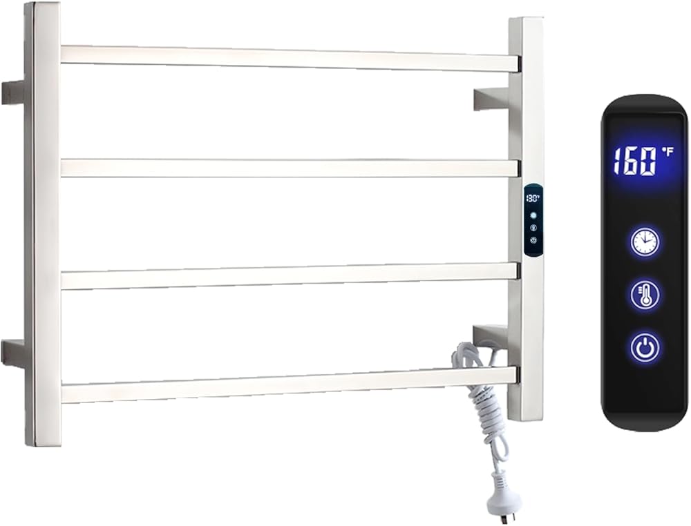 Towel Warmer Rack for Bathroom, Timer&Fahrenheit Temperature Control Wall Mounted Electric Heated 4 Bar Plug-in or Hardwired Keep Bath Shower Towel Warming (Mirror Polished, Plug-in)