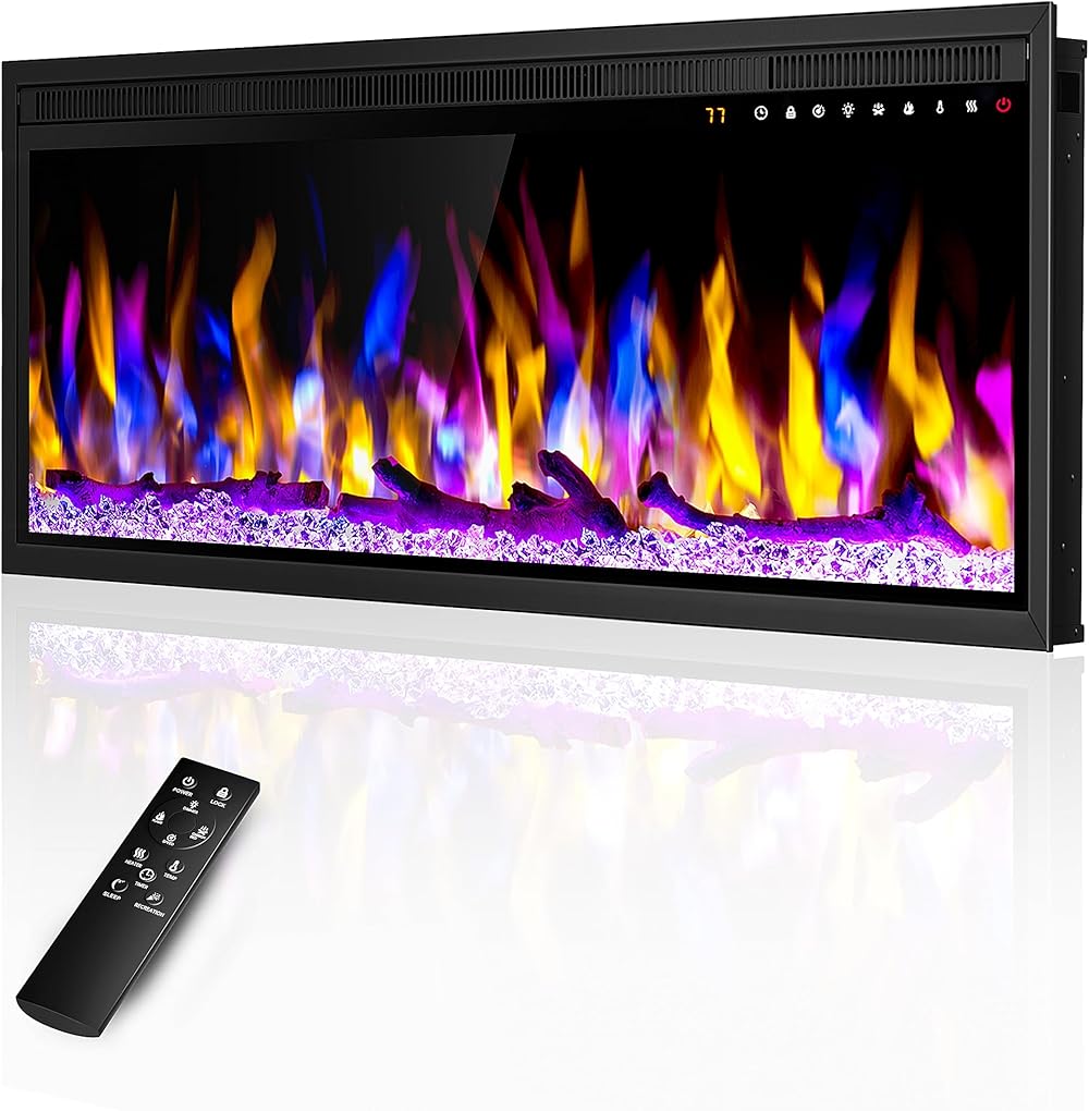 36 Inch Electric Fireplace Heater, Recessed in-Wall and Wall-Mounted Linear Heater Fireplace,13 Adjustable Flame Color and 5 Brightness,Touch Screen & Remote Control,1500/750W, Black
