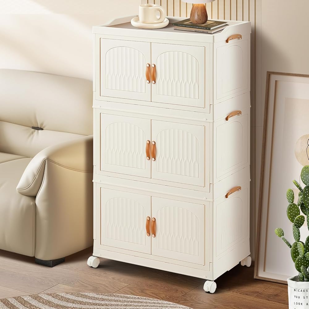 29Gal Foldable Plastic Storage Cabinet with Doors 3 Tier Large Folding Stackable Storage box with Lids White Tall Nightstand for Bathroom,Bedroom,Living Room