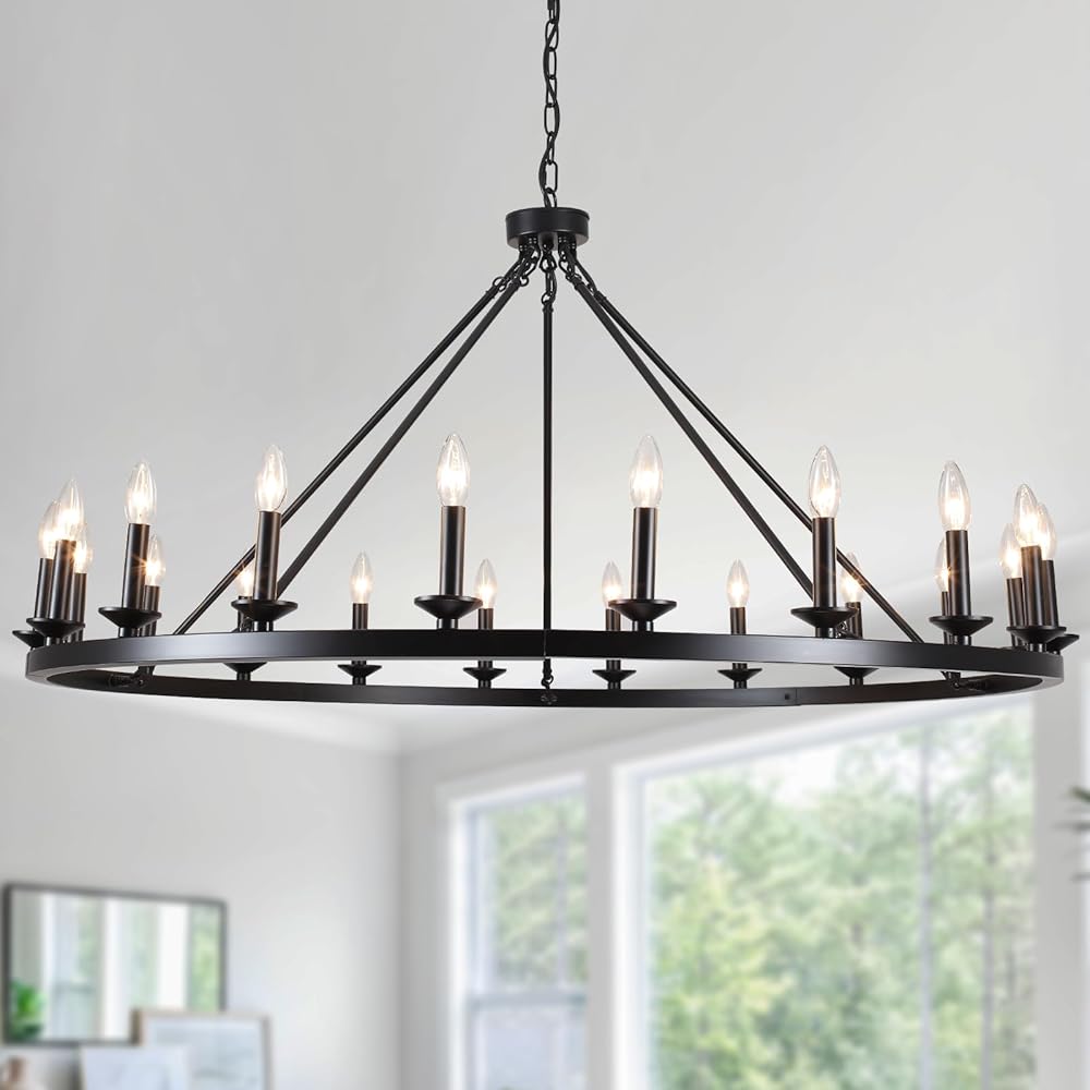 47.24'' Large Wagon Wheel Chandelier 20 Lights Farmhouse Black Chandelier for Dining Room Rustic Vintage Round Candle Pendant Light Fixture Living Room Kitchen Island