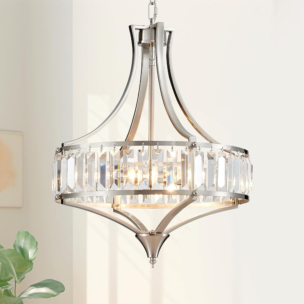Crystal Dining Room Chandelier Light Fixture, Modern Round Brushed Nickel Chandeliers for Kitchen Hallway Bedroom Foyer Living Room, 4-Light Farmhouse Adjustable Height Hanging Light, 16 Inch