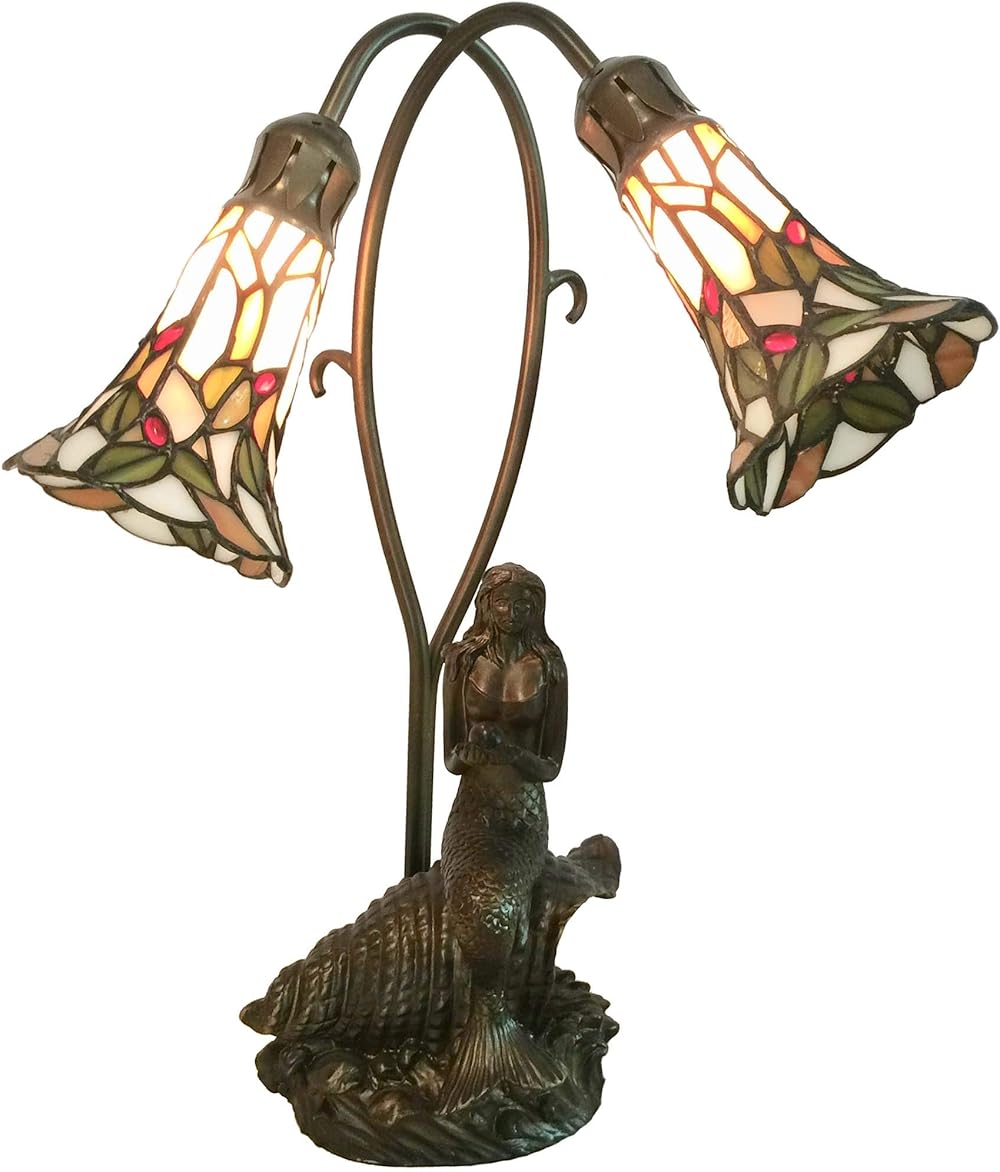 Bieye L10625 Mermaid and Lily Flowers Tiffany Style Stained Glass Accent Table Lamp, 20 inches Tall