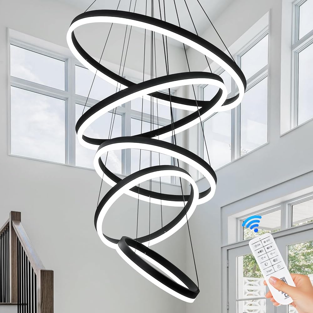 5-Rings Modern LED Chandelier Black Dimmable Chandeliers for Dining Room, High Ceiling Chandelier with Remote Control for Foyer Living Room Entryway Staircase(D23.6’’, 3000K-6500K)