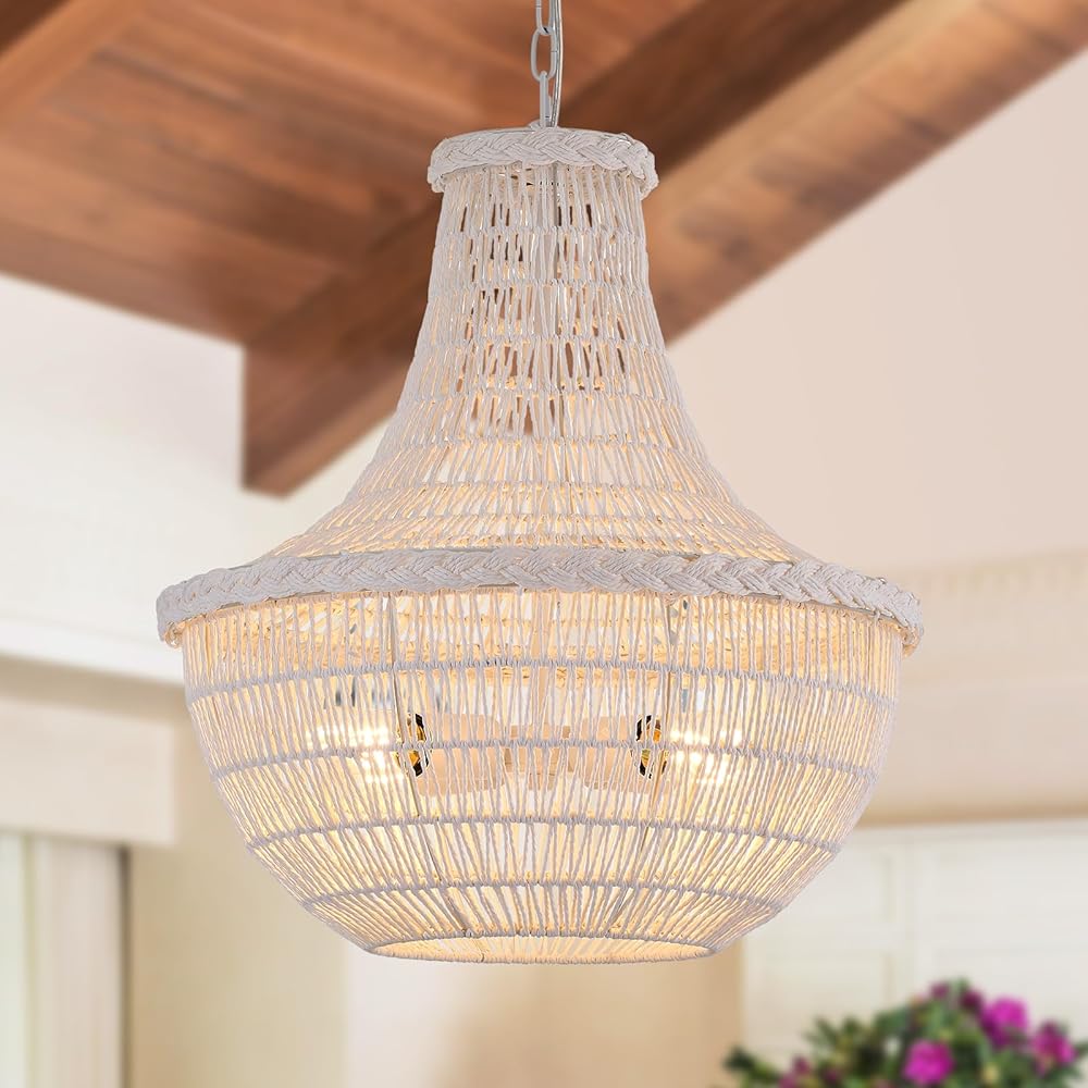 Farmhouse 4-Lights White Hand-Woven Rattan Chandelier Vintage Boho Bamboo White Chandelier Light Fixture Retro Rustic Wicker Rattan Chandelier for Dining Room, Kitchen, Living Room, Bedroom